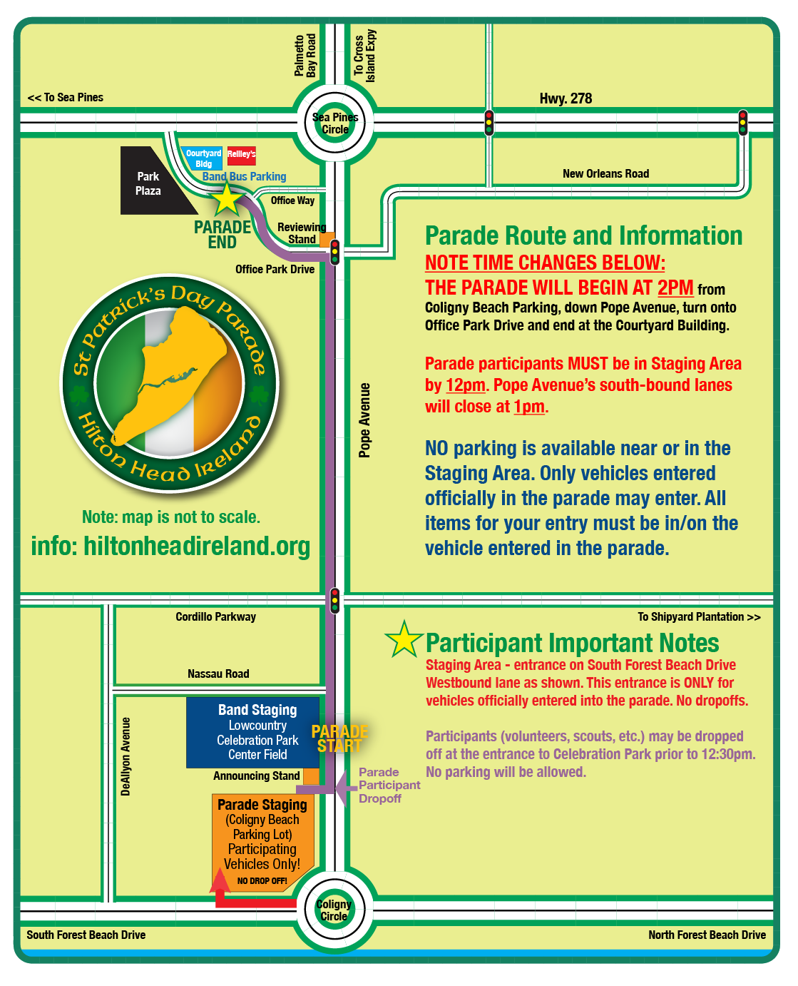 To get to the Staging area: use Pope Avenue, then at Coligny Circle, take the first right onto South Forest Beach Drive. Stay in the right lane and parade coordinators will assist you. ONLY vehicles entered officially in the parade may enter staging. Place all decorations, etc. in the official vehicle prior to entering staging.